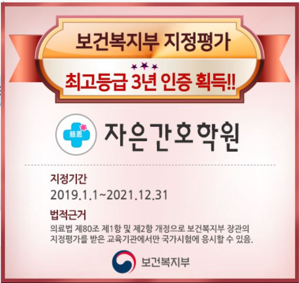 본원은 보건복지부에서 간호조무사 교육기관 3년 지정받은 교육기관으로서 간호교육에 최선을 다하겠습니다.
