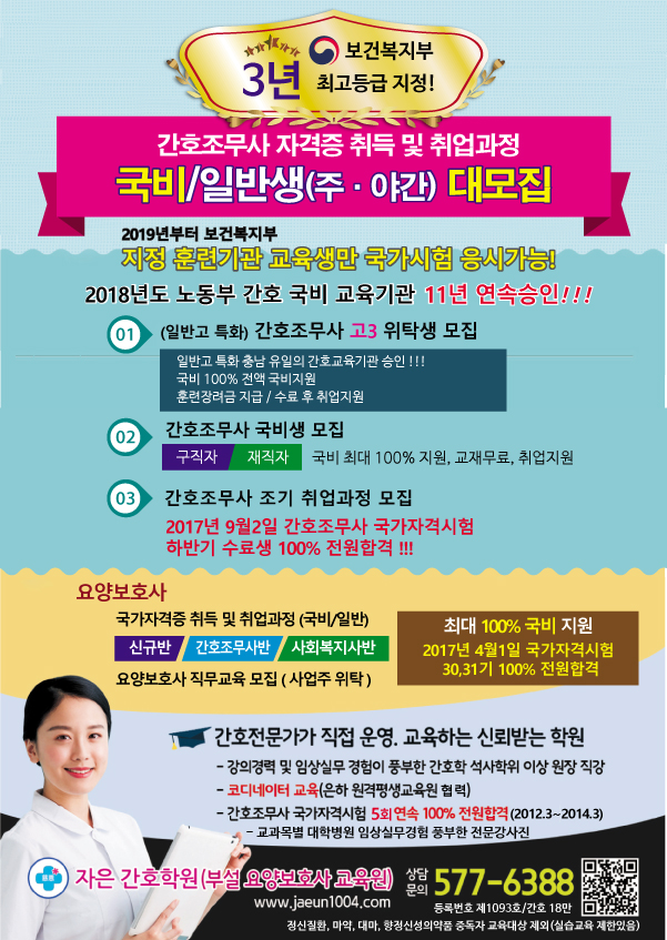 * 우리학원 보건복지부 교육훈련기관 지정. 평가 3년 인증을 받은 교육기관이며 취업이 되는